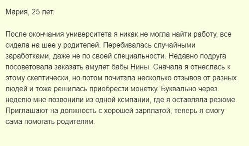 Амулет от бабы Нины является тем оберегом, с которым именной носитель получает первобытную защиту к современным изобретениям, в том числе, перестанет отторгать деньги. Помимо этого, будет открыт для карьерного роста, начнет выходить из зоны комфорта, чего раньше быть не могло, из-за сопротивления подсознания.